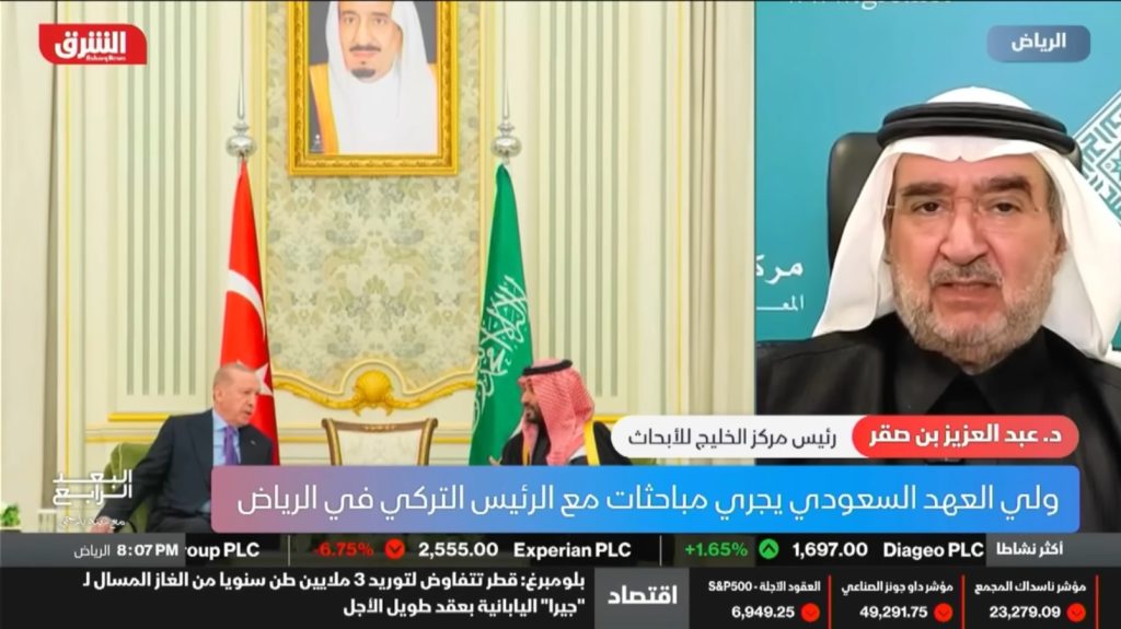 مشاركة رئيس مركز الخليج للأبحاث،الدكتور عبدالعزيز بن صقرضمن برنامج (البعد الرابع) على تلفزيون الشرق (بلومبيرغ)، في حلقة بعنوان: “السعودية وتركيا..