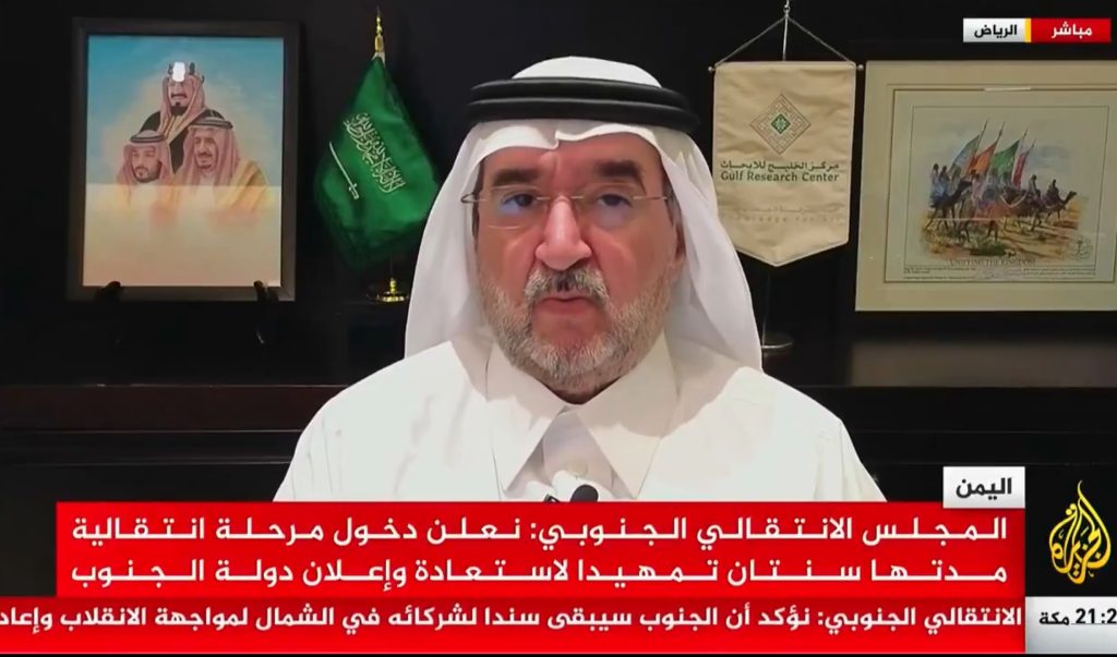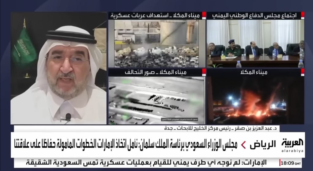 مداخلة رئيس مركز الخليج للأبحاث،الدكتور عبدالعزيز بن صقر،عبر قناة العربية، حول آخر التطورات في اليمن بعنوان:▫️مجلس الوزراء السعودي يدعو الإمارات